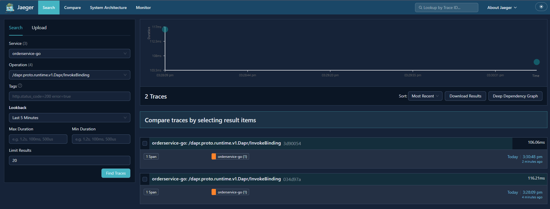 Zipkin works well for local debugging, but some teams choose to use OpenTelemetry collectors and Jaeger v2 in production for deeper analysis, scalable retention, and more flexible sampling. Because Dapr emits OTLP‑compatible traces, Jaeger v2 can be added without modifying your services.