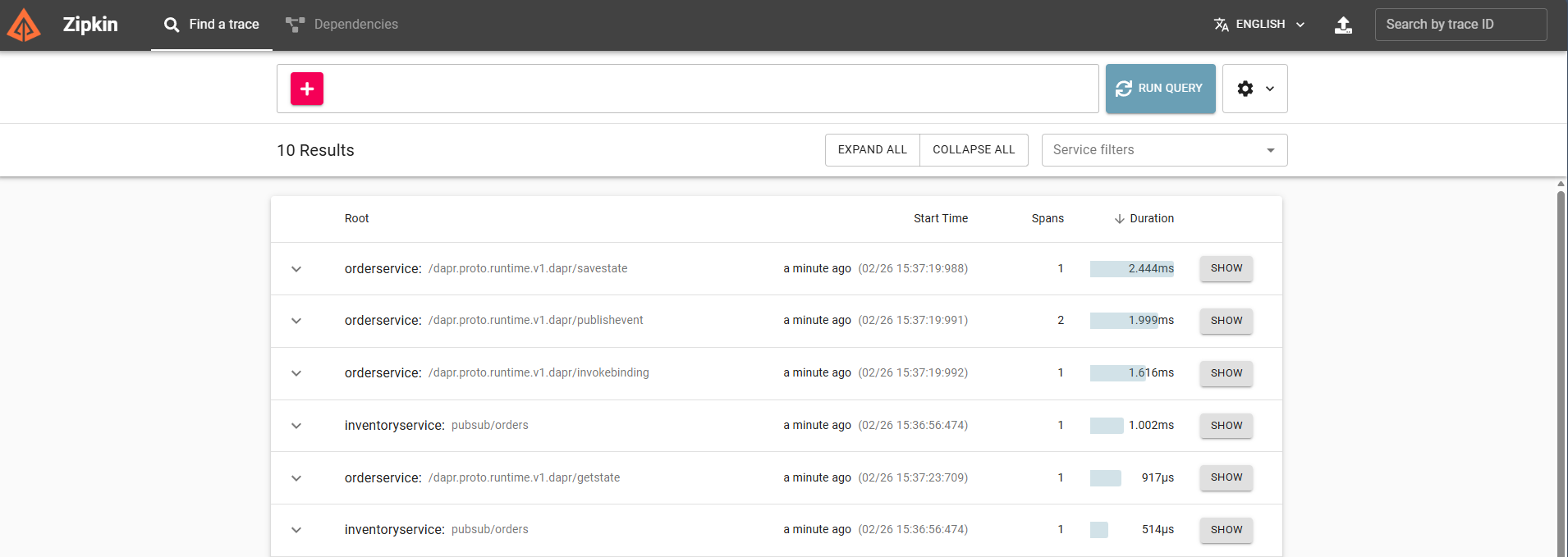 As soon as you send a request through your service, Zipkin will show a trace containing: