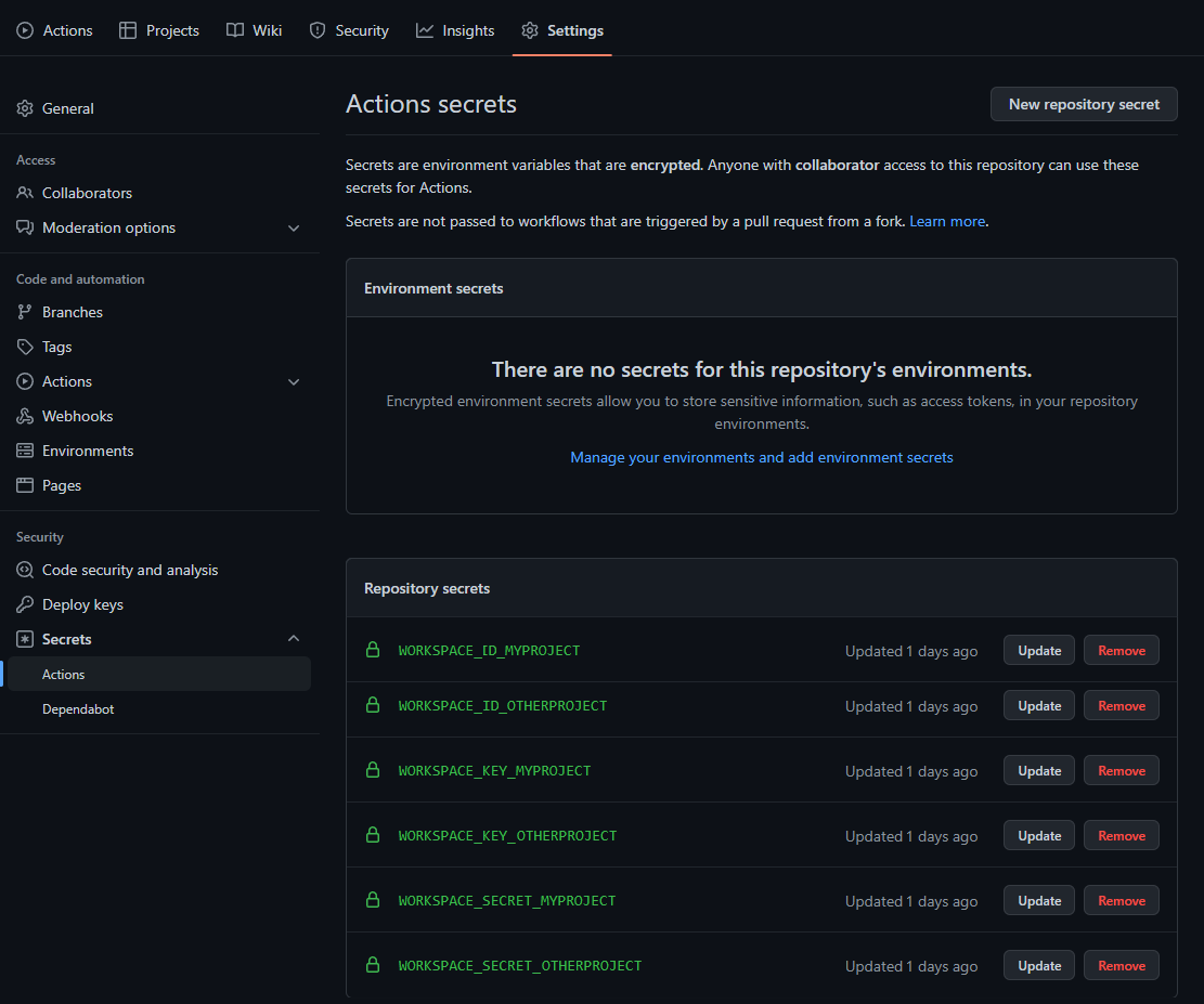 Now we have the GitHub action defined we now need to add the secrets for each workspace using Secrets in GitHub