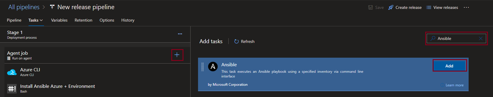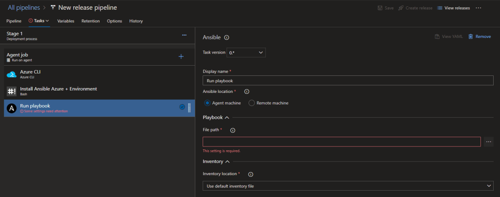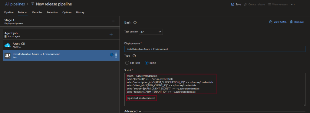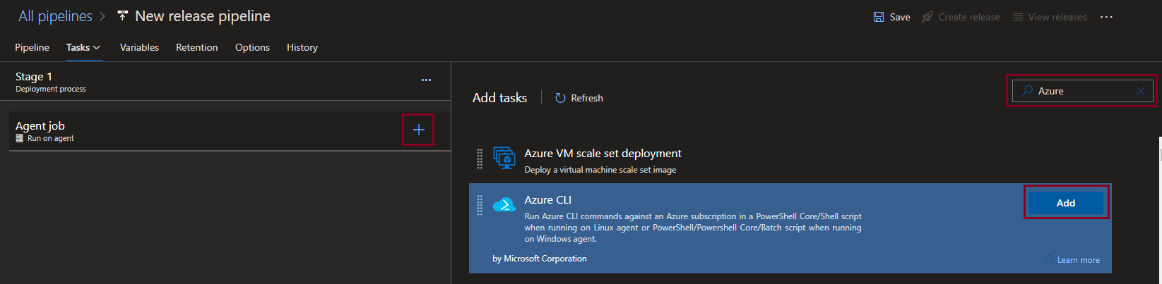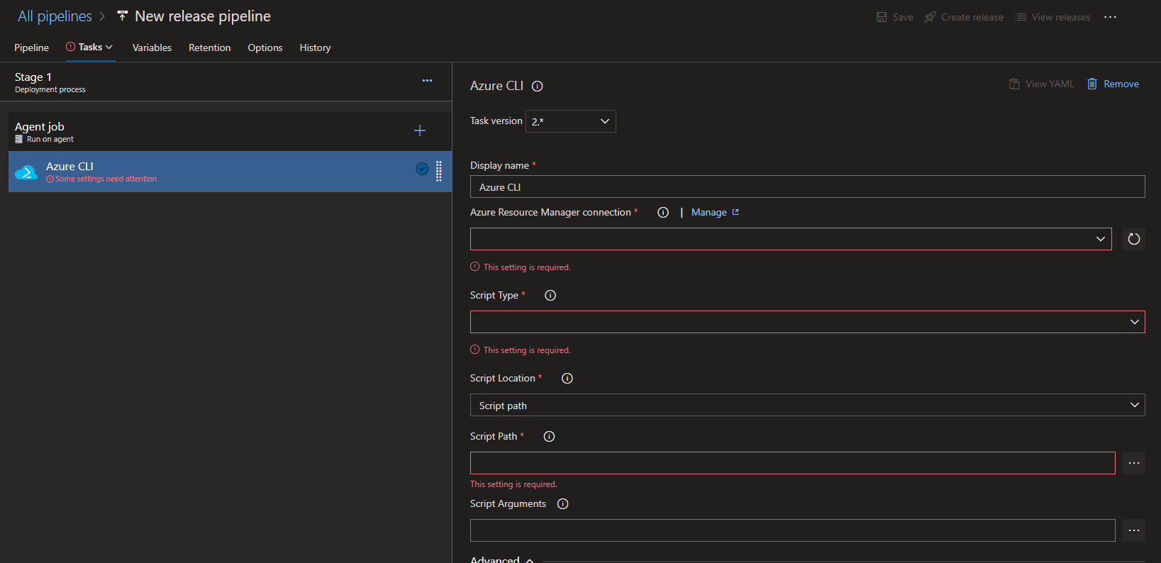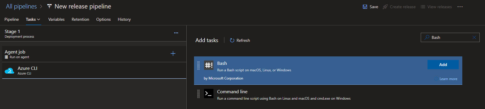 To setup the Azure storage for the AzureRM backend I will add an Azure CLI task.